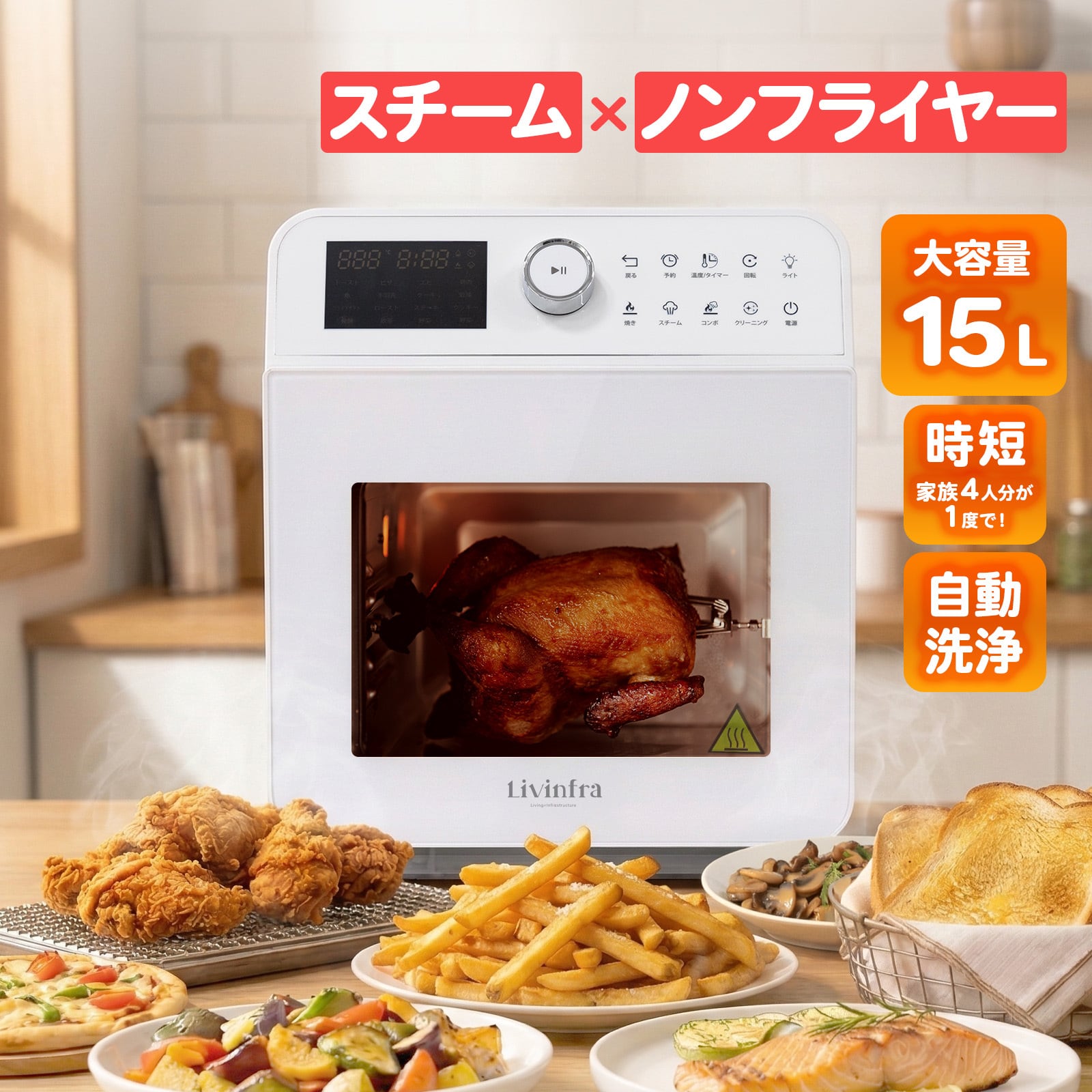 Livinfraスチームノンフライヤーは、『蒸し』・『焼き』・『蒸し焼き』の3機能を搭載した多機能オーブンのような存在。